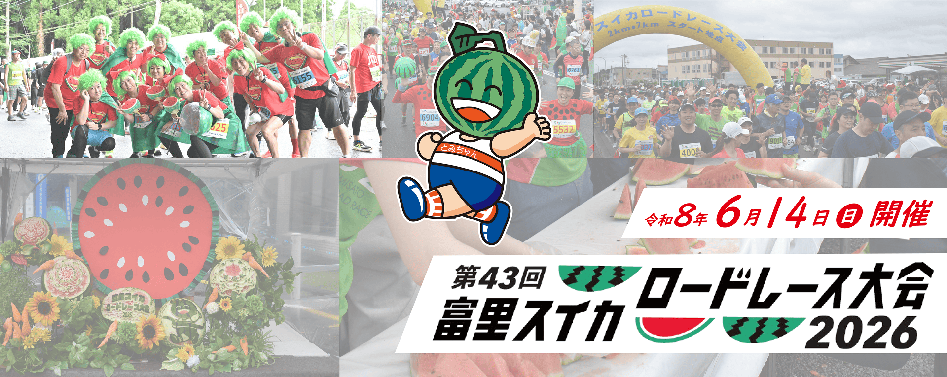 新着情報 一覧へ 2026.01.09 お知らせ第43回富里スイカロードレース大会[ファンクラブ会員枠]申込受付開始! 2026.01.09 お知らせ第43回富里スイカロードレース大会[メディカルアシストランナー枠]申込受付開始! 2026.01.07 お知らせ「第43回 富里スイカロードレース大会」の大会情報を掲載しました!